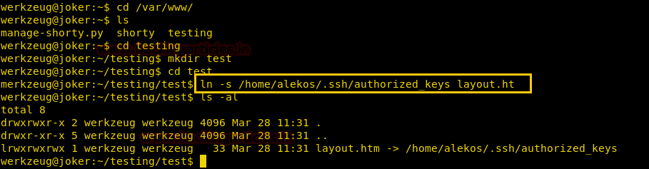 cd /var/www/ cd testing mkdir test cd test ln -s /home/alekos/.ssh/authorized_keys layout.html