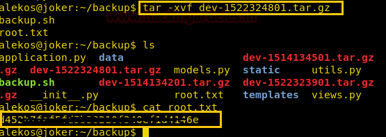 We then wait for a few minutes for the file to create backup for the new development folder. As the development links to the root folder, it will create a backup for the root folder. Now we open the new tape archive file that we create and find a file called root.txt; we open it and find the final flag.