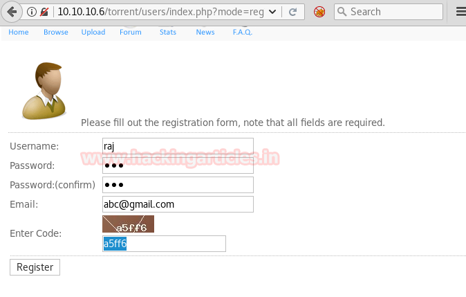 So next we decided to explore http://10.10.10.6/torrent/ through the browser URL, and we see a webpage displayed below. After looking at the page for some clue, we saw that we need to register on this site first.