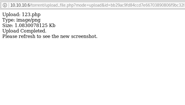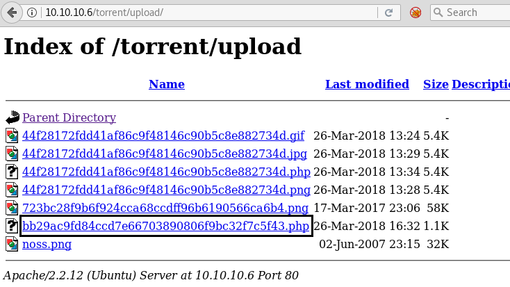 So next we decided to explore http://10.10.10.6/torrent/upload/ through the browser URL, and we see a Webpage shown below. We confirm that we successfully uploaded our file. By click on the file, we have uploaded.