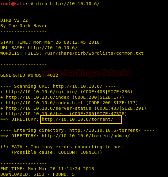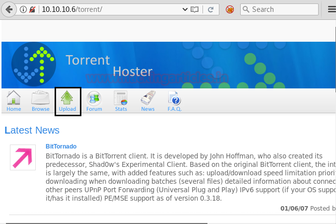 Then, we have used dirb tool of Kali to enumerate the directories from using the IP Address. The command we have used is dirb http://10.10.10.6 After checking most of the directories, we finally decided to go for /torrent directory.