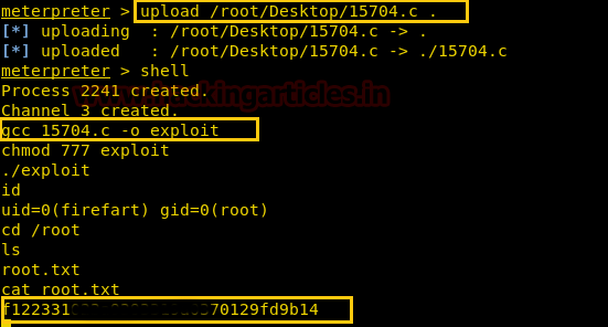 As you can see we have uploaded using the command upload /root/Desktop/15704.c Now we have used the command shell to access the root privilege. Now we have compiled. Next, we have given permission to the exploit. Using cd /root command we have found a root.txt file. And to view the contents we have used cat root.txt command. In the end, we have found our Final FLAG!!