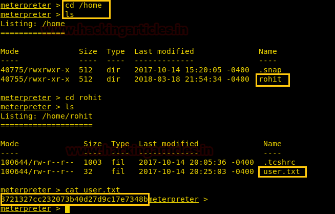 Once we have got the meterpreter. We have used command cd /home to check what kind of directories are on home. Then we check inside the rohit directory using command ls /home/rohit, here we found out the user.txt file and used cat user.txt to read the file content which contains our first FLAG!!