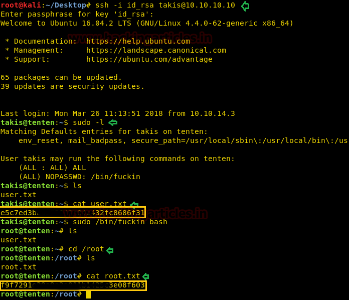 Great!! I logged in successfully and check Takis’s privileged and roles using sudo -l and found he has all privileged and an indication for a directory /bin/fuckin with NOPASSWD.