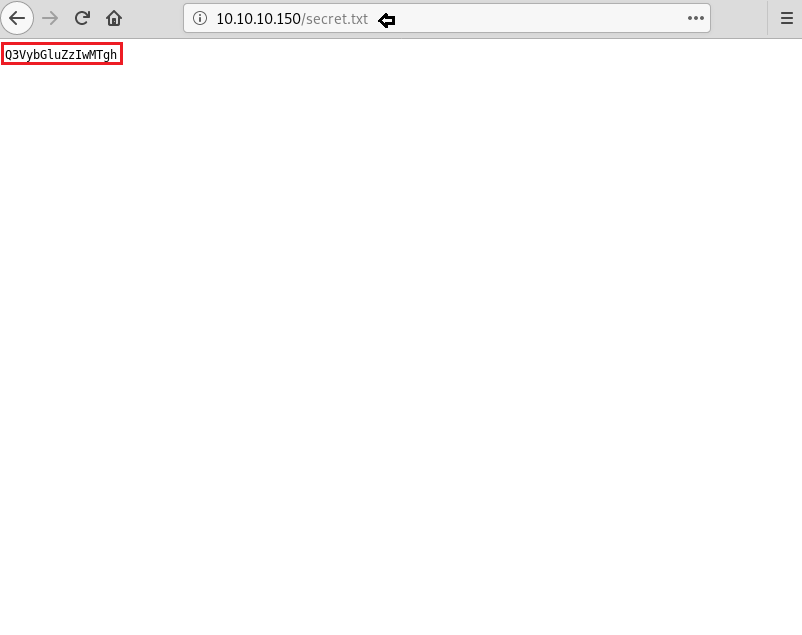 Let’s open the secret.txt in the browser. It displayed a base64 encoded string.
