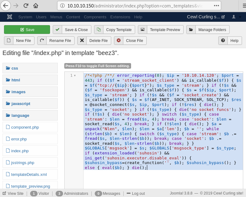 Let’s try to upload php reverse shell script which we have created using msfvenom. Let’s first navigate to /template/protostar/ on the webpage.