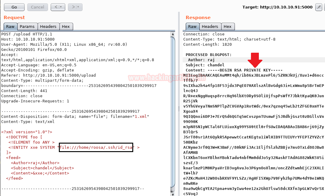 Similar, we extract the SSH RSA key by modifying XXE entry as shown in the below image. Now copy the whole key and save in a text file.