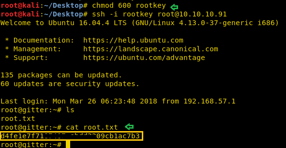 chmod 600 key ssh -i rootkey root@10.10.10.91 ls cat root.txt