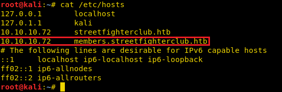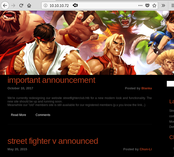 In the homepage, we find the Domain name “streetfighterclub.htb”. We add the domain to our /etc/hosts file.