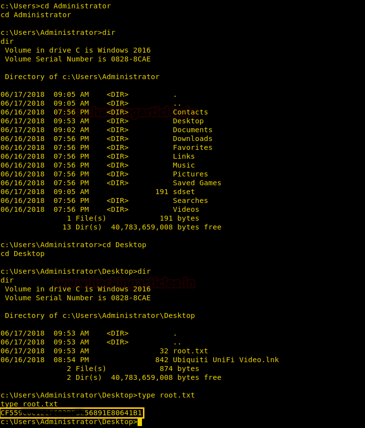 We now enumerate the system, inside “C:\Users\Administrator\Desktop” we find a file called “root.txt”. We take a look at the content of the file and find the final flag.