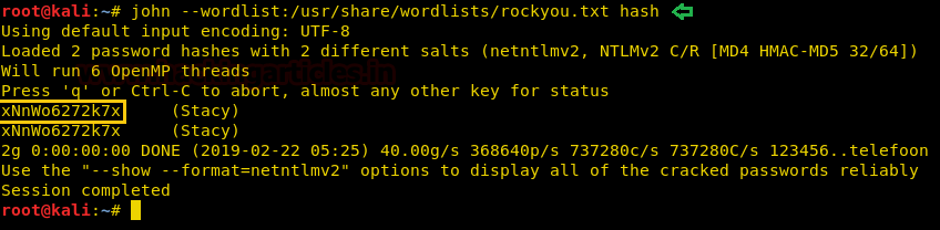 We copy the hashes and store it in a file in our local system and use john the ripper to crack the hashes. After cracking NTLM hash we are successfully able to get the correct password to be “xNnWo6272k7x”.