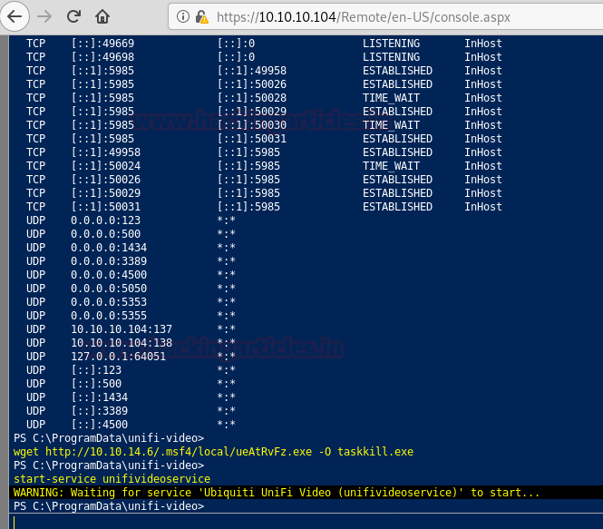 Now we upload our payload on the target machine using the PowerShell web portal. According to the POC we have to put the payload by the name of taskkill.exe inside “C:\ProgramData\unifi-video\”. After uploading the payload we start the unifi video service.