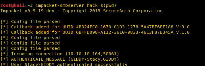 Now we can see on our smbserver that the hashes were captured when the remote machine to tried to connect.
