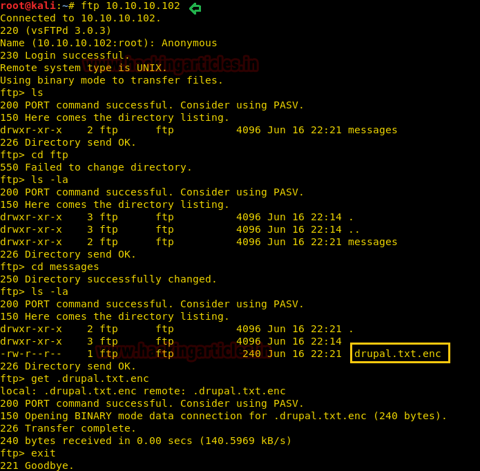 We easily connected to ftp through Anonymous Login. Moving on, after navigating through multiple directories we found a hidden file i.e. “.drupal.txt.enc “and then we transferred the file to our local machine.