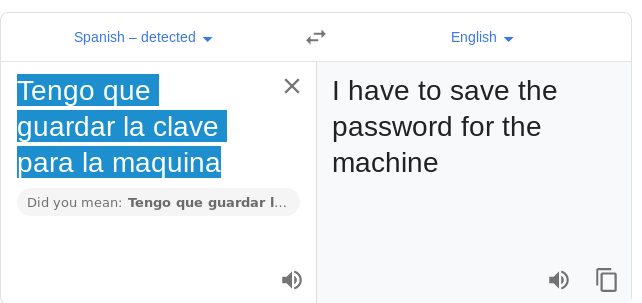 So, I translated the Spanish text message: “Tengo que guardar la clave para la maquina” = “I have to save the password for the machine”