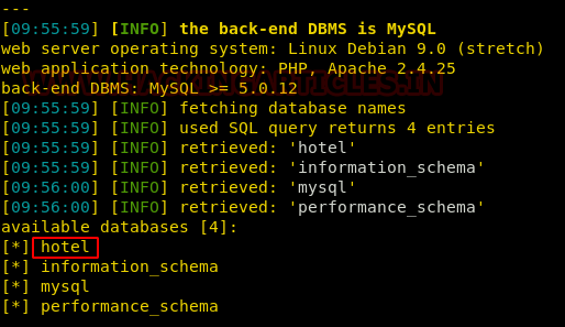 We see 4 databases running on the web application server out of which only one database, i.e, hotels seemed interesting.
