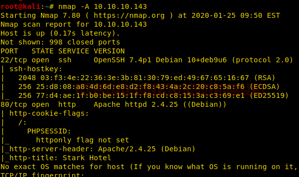 We used the nmap aggressive scan on our target IP 10.10.10.143 and observed that ports 22 and 80 were open.
