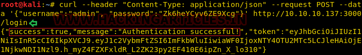 curl --header "Content-Type: application/json" --request POST --data '{"username":"admin", "password":"Zk6heYCyv6ZE9Xcg"}' http://10.10.10.137:3000/login