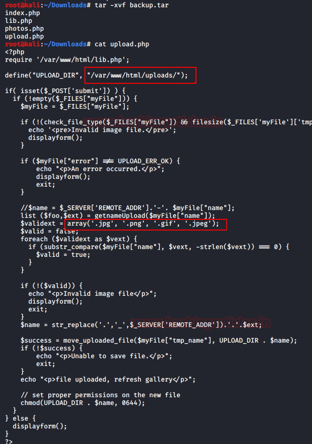 So, basically, it holds some php files like index.php, lib.php, photos.php, and upload.php. Then we explored upload.php file where this file has been linked to uploads directory to validate uploaded photo via extensions like jpg, png, gif & jpeg.