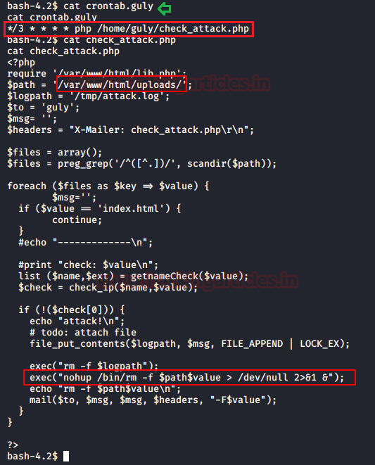 Then I explored crontab.guly where I found a cronjob running in the background to run attack php file every three minutes after that, the attack.php file will check for the malicious content inside /var /www /html/uploads and report it by mail to guly. In addition, the “exec” function here is used for “nohup”, which stands for No Hungup.