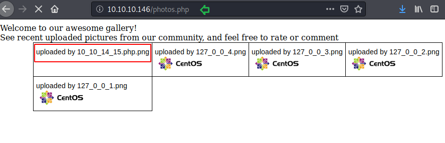 So, again we browse the http://10.10.10.photos.php file and found the link for our malicious file that we have uploaded.