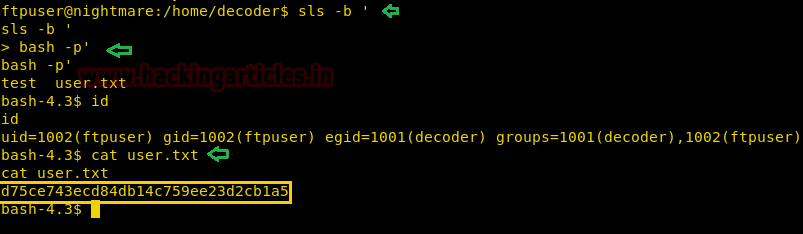 After getting a shell we run “id” command and find that we have spawned a shell as user “decoder”. We now can open “user.txt” file and find the first flag.
