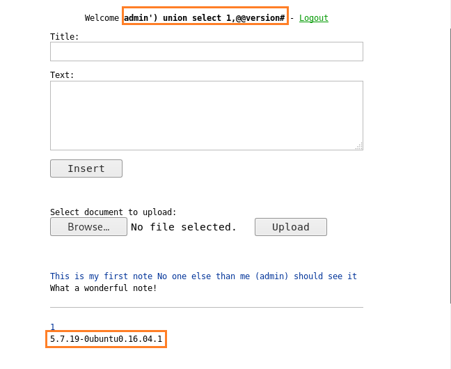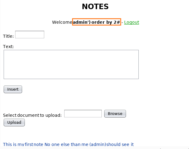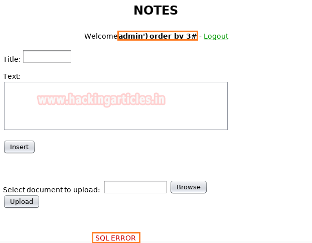 First, we register a user with credentials “admin’): pass” using the register link on the login page. Now when we login using this user we get an SQL error on the web page.