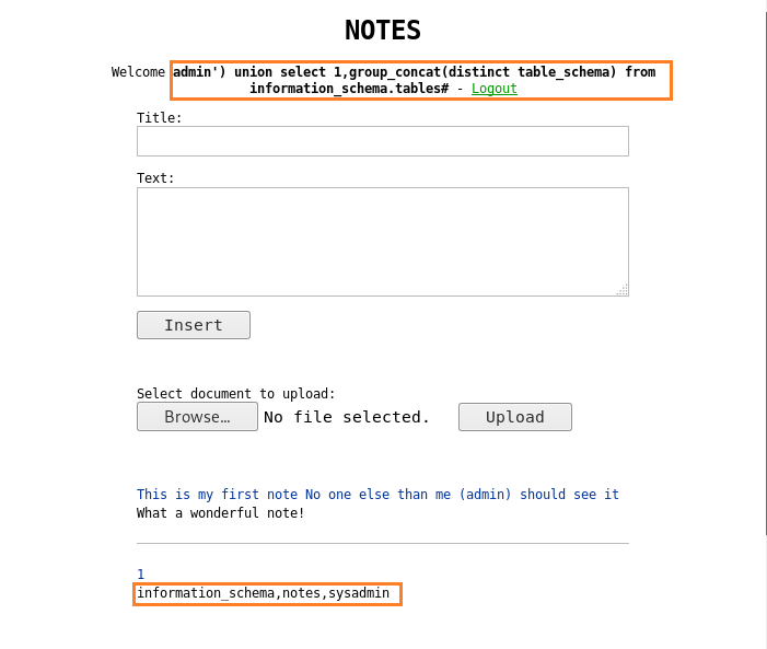 Now we get the database to be called “notes” but we want the names of all the databases on the server. So we register a user using the following query: