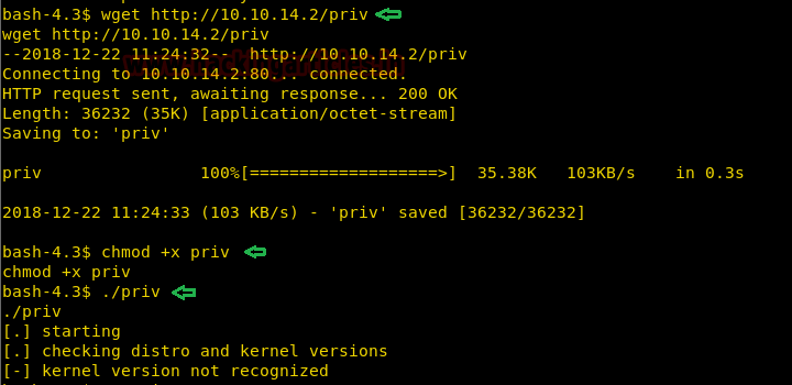 We download the code on our machine and compile it using gcc. Then we start python http server and send the compiled exploit file to the target machine. When we run the exploit we are unable to get a privileged shell as it shows an error saying that the kernel version is not recognized.
