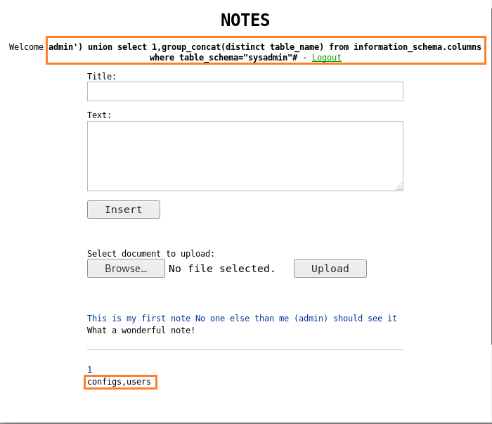 We get another database called “sysadmin”; we find the table names inside “sysadmin”. To find the table names with we register the user with the following query: