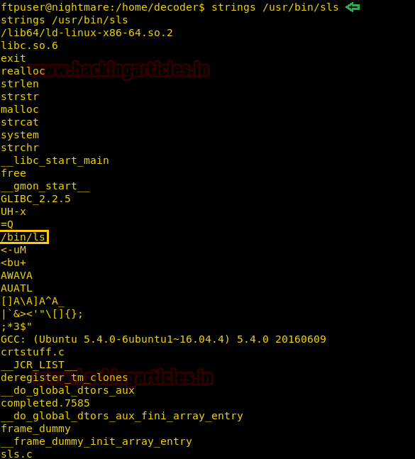 We use strings command to check the binary and find that it is using system function to execute the “ls” command.