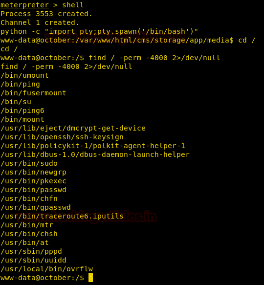 Now spawn a tty shell and try to find binaries in the system with suid bit set.