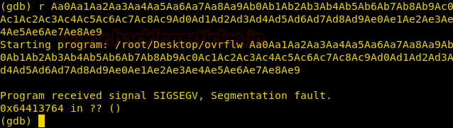 Then, we run the file in gdb along with the 150 byte character as the argument and find that something overwrote the EIP register with 0x64413764.