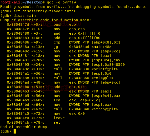 Then, we open the file in gdb and take a look at the assembly code. At line main+64 we find the strcpy function, As strcpy is vulnerable to buffer overflow we try to exploit it.