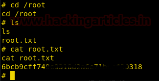 After getting the root shell, we move to /root directory and find a file called root.txt we open the file and find the first flag.