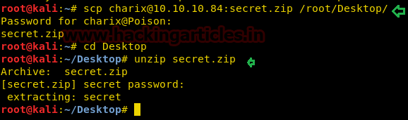 scp charix@10.10.10.84:secret.zip /root/Desktop/ cd Desktop unzip secret.zip