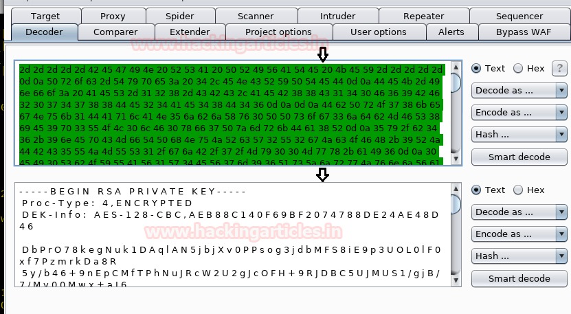With help of burp we try to decode above hex into plain text as shown in the image. So it’s a RSA private key, but it has space after each character, which needs to be fixed.